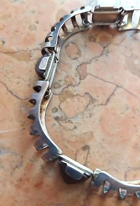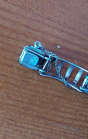 Článkový stříbrný náramek s jaspisy ze stříbra ryzosti 835/1000. Značen rybičkou (značka výrobce - roku 1958 do roku 1990 se používala stylizovaná ryba), ryzostním číslem 835, platným českým puncem, délka 18 cm, šířka 1 cm, hmotnost 15,98 g, ca 60. léta 20. století. Výborný stav, funkční zapínání s pojistýn řetízkem. Šperk ze staré německé šperkařské firmy Fischlandsmuck (G.Kramer), pracující v druhé polovině dvacátého století zejména se stříbrem a jantarem.