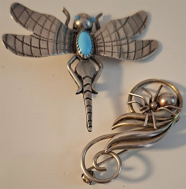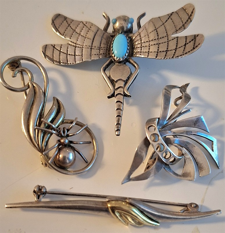 - Velká stříbrná brož . vážka s tyrkysem, stříbro 925/1000 (cizí zboží, puncováno českým puncem, značeno mistr, značkou FY, hmotnost 8g, rozměr 5,5 x 4,5 cm -Zlatostříbrná brož s květem, stříbro 925/1000, puncováno (kozlík), 6,3 x 1 cm, 6 g - Stříbrná brož s listy s pavoukem, 4,3 x 2 cm, 6 g, stříbro 900/1000, puncováno, - Stříbrná brož – mašle, stříbro 900/1000, 4,5 x 3 cm, puncováno 5g