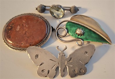 - Velká stříbrná brož s hnědočerveným jaspisem, stříbro puncováno 800/1000, 20. léta m.s, rozměr 4,2 x3,5 cm, hmotnost 11g, - Stříbrná brož s centrálním citrinem, stříbro dodatečně puncováno 900/1000rozměr kamane 1,5 cm, rozměr brože 4,2 x 1 cm, hmotnost 5g - Stříbrná brož ve tvaru motýla, puncováno stříbro 900/1000, rozměr 5,2 x 2,5 cm, 20,léta m.s., 8 g - Brož ve tvaru listu s beruškou, smalt, stříbro, dodat puncováno 800/1000, 5x3,5, 20. léta m.s., 12g,