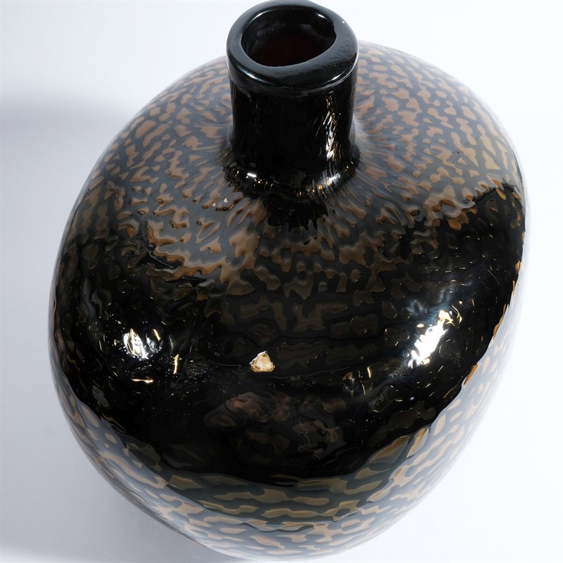 návrh kolem r. 1966 sklářská výtvarnice Dagmar Kudrová (1934), provedení Josef Flek (1922-2002) na huti Výzkumného ústavu užitého skla (VÚUS) v Novém Boru, neznačeno, 22 x 27 x 21 cm, hutně tvarované tmavohnědé sklo foukané do optické formy a přesklívané čirým sklem, drobná výrobní nepravidelnost ve stěně, velmi zřídka vídaný exemplář. Ref.: Archiv Sklářského muzea v Novém Boru, složka VÚUS, Nový Bor / 18, karta 14/66 (struktura skloviny středního kusu).