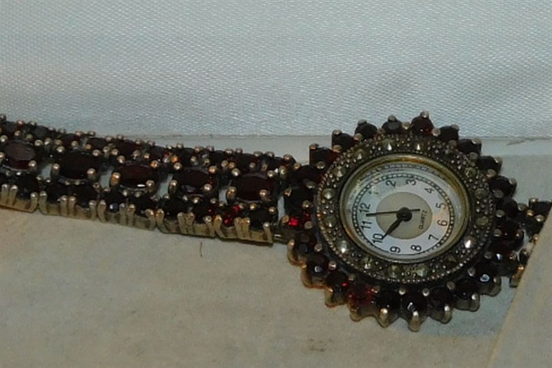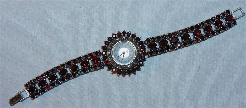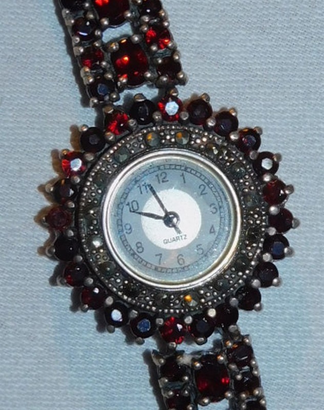 Dámské náramkové hodinky - stříbro, punc. značka + ryzostní 925, strojek Quartz, délka celkem 18 cm. Osazeno 105 almandiny a 25 markazity. Zadní strana strojku značena Stainless Steel Japan. Perfektní stav, funkčnost nezkoušena. Vyrobeno asi v poslední čtvrtině 20. století.