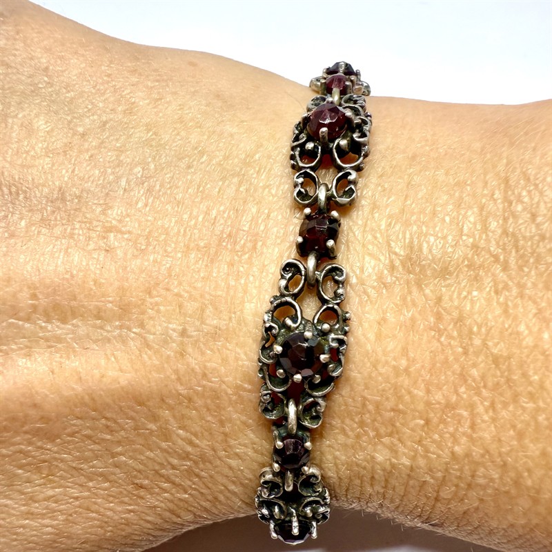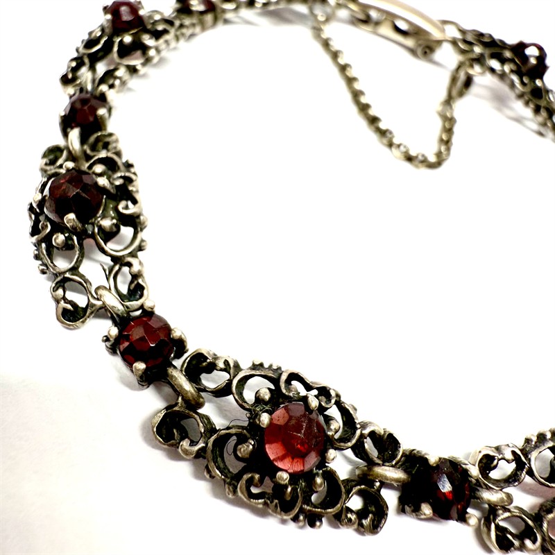 Jemný, dekorativně zdobný, článkový náramek. Šperk byl vyroben ze sterlingového stříbra (925/1000), o celkové váze 15,07 g. Každý z jednotlivých článků zdobí almandin pečlivě zasazený do krapen. Přítomen pojistný řetízek proti ztrátě. Délka 19 cm, šířka 7 mm. Výborný stav.
