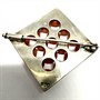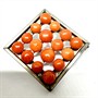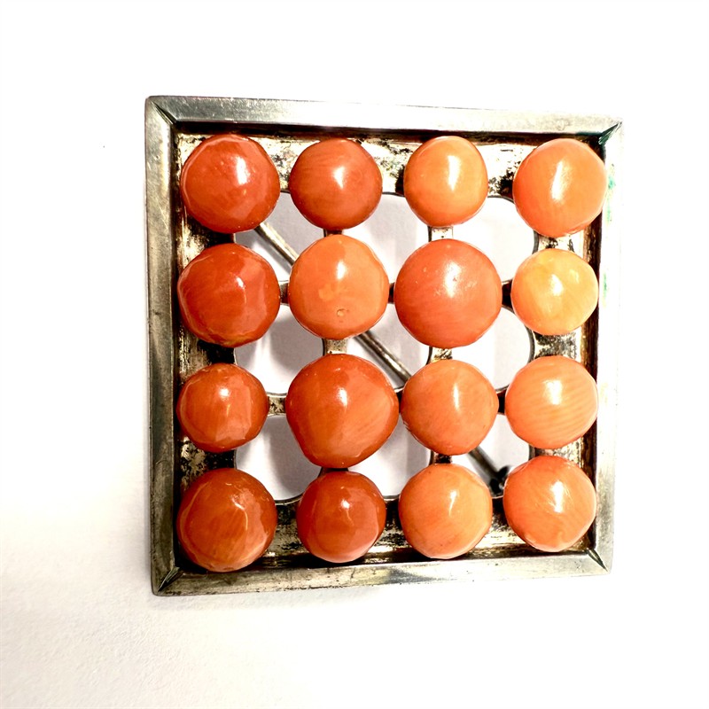 Originální, nadčasová stříbrná brož kosočtvercového tvaru. Šperk zdobí 16 korálů, sytého oranžovočerveného odstínu a vysoké kvality. Šperk byl vyroben ze stříbra ryzosti 800/1000 počátkem 20.století ve velmi nadčasovém designu. Celková váha 10,18 g. Rozměry 2,5 x 2,5 cm.