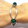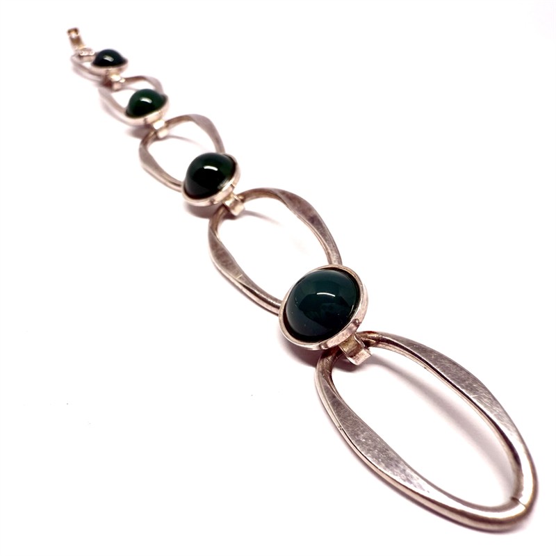 Designový, článkový náramek zdobený chryzoprasy. Šperk byl zhotoven ze stříbra ryzosti 925/1000 (Sterling) o celkové váze 21,80 g. Délka 18 cm, šířka 1,7 cm. Nevšední, velmi příjemně nositelný šperk v perfektním stavu.