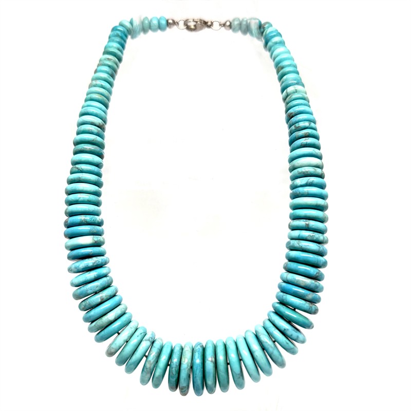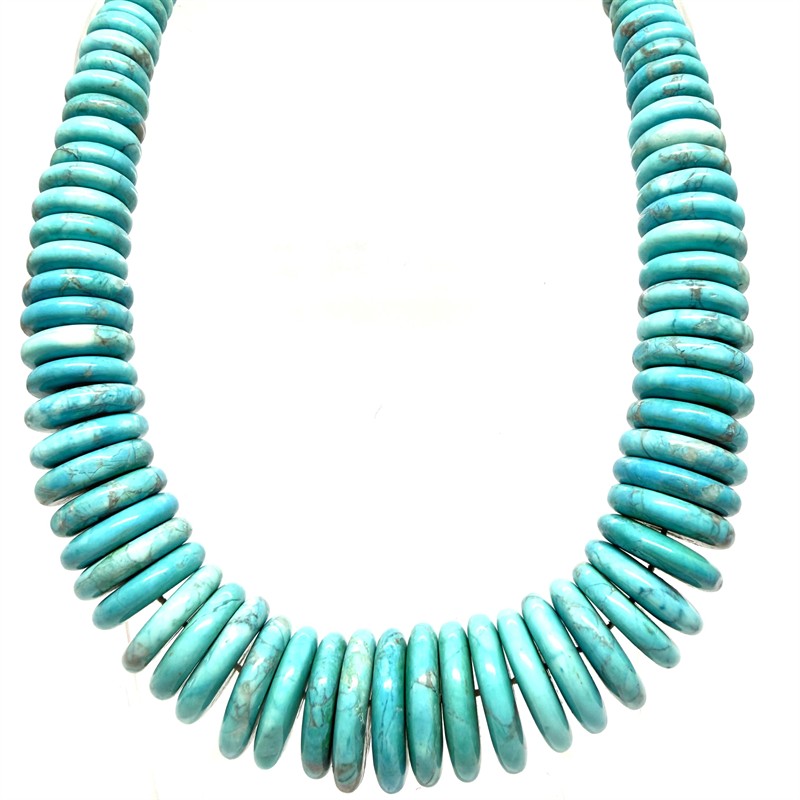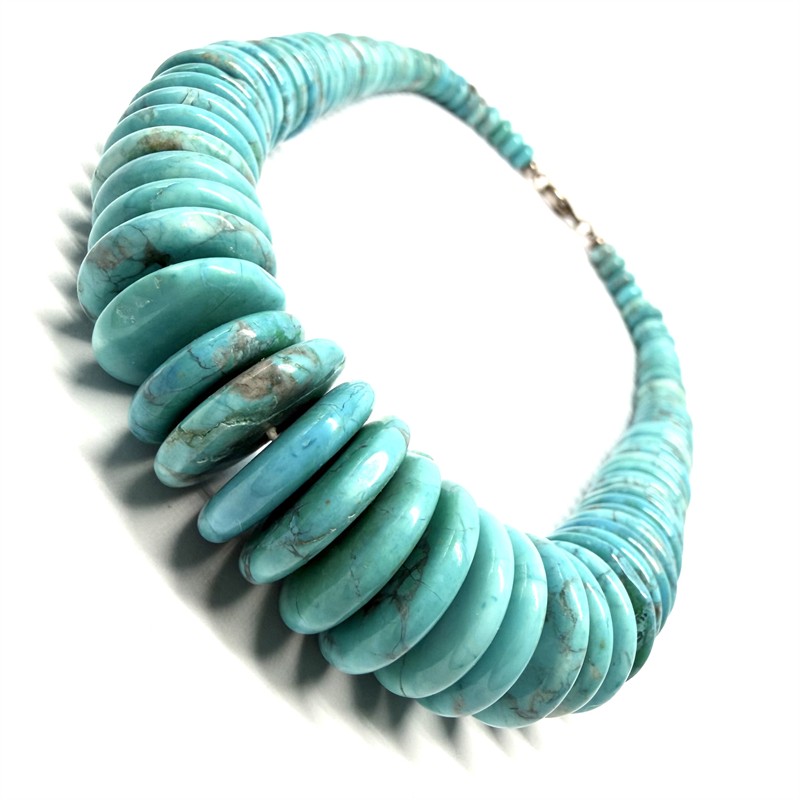 Nepřehlédnutý, designový náhrdelník z tyrkysového magnezitu. Náhrdelník dlouhý cca 46 cm je zakončen zapínáním ze sterlingového stříbra. Celková váha šperku 162,45 g. Výborný stav.