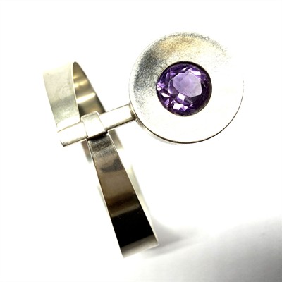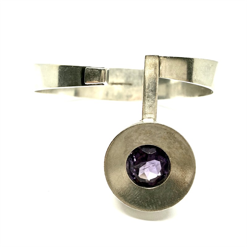 Nadčasový, minimalistický, osobitý stříbrný náramek, Šperk s rafinovaně skrytým zapínáním zdobí sytě fialový ametyst fazetového brusu. Zhotoven legendární finskou firmou Kupittaan Kulta z Turku. Šperk se pyšní vysokou řemeslnou kvalitou a moderním, nadčasovým designem. Vhodné spíše na útlé až normální zápěstí. Značeno. Perfektní stav.