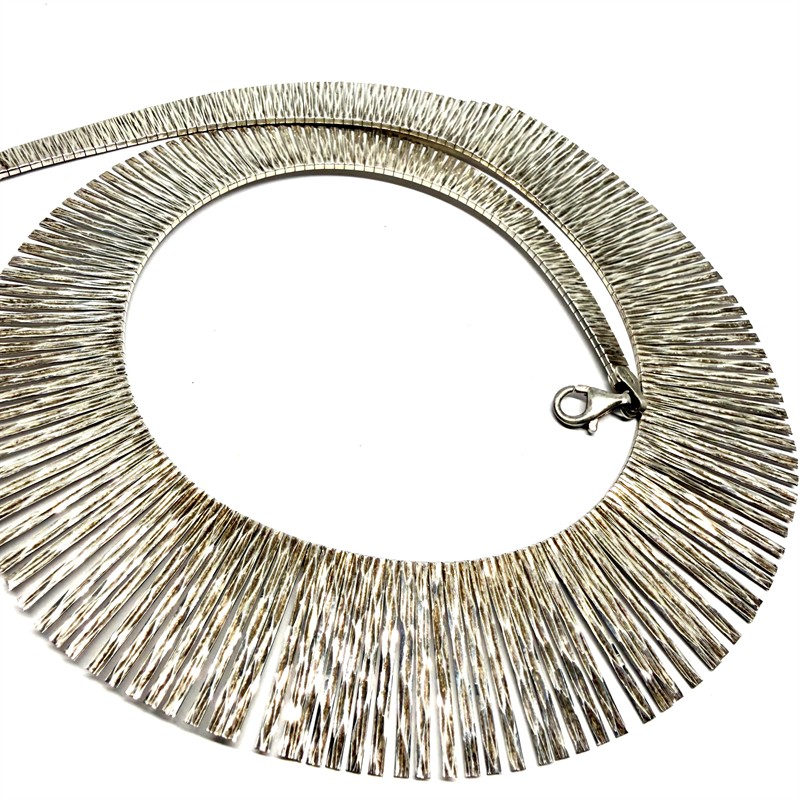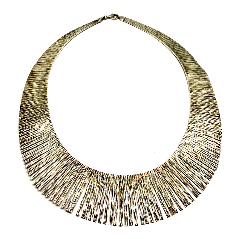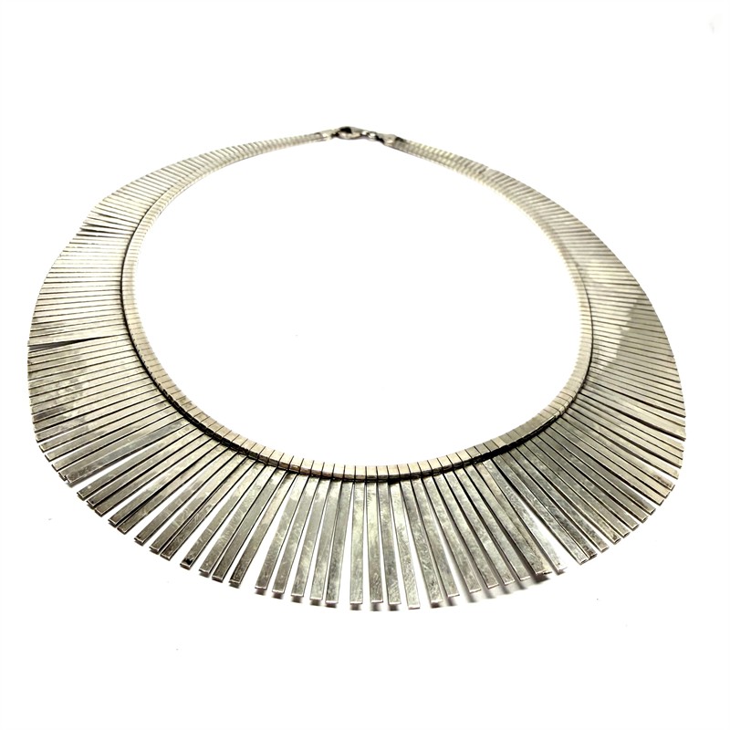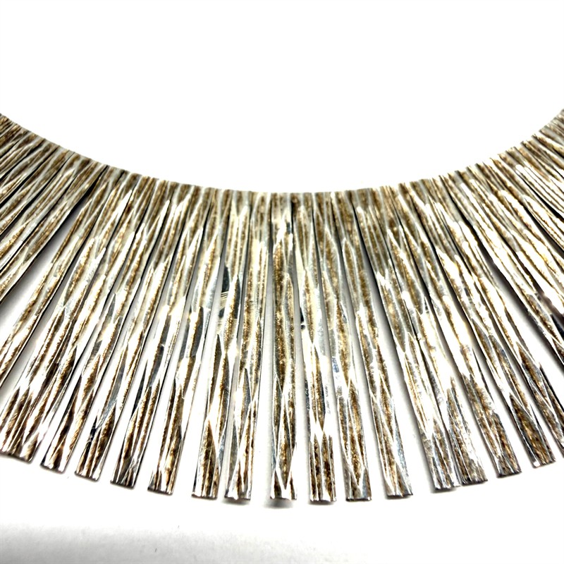 Výrazný, designový, stříbrný náhrdelník ze 60. let minulého století. Šperk je velmi efektní a připomíná sluneční paprsky. Stříbro ryzosti 925/1000, o celkové váze 40,63 g. Délka cca 45 cm. Perfektní, původní stav.