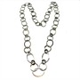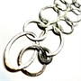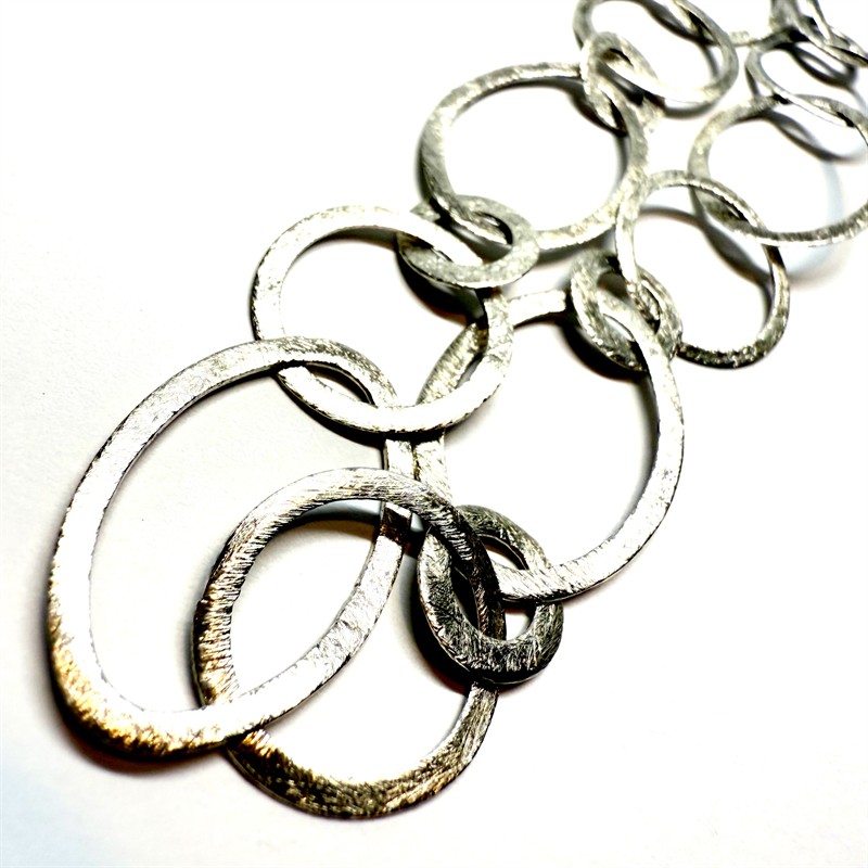 Dlouhý, designový, stříbrný náhrdelník. Šperk tvoří vzájemně propojená, různě velká oka. Výraz šperku umocňuje matovaný povrch. Stříbro ryzosti 800/1000, celková váha 25,57 g. Délka cca 85 cm. Originální, designový náhrdelník v perfektním stavu.