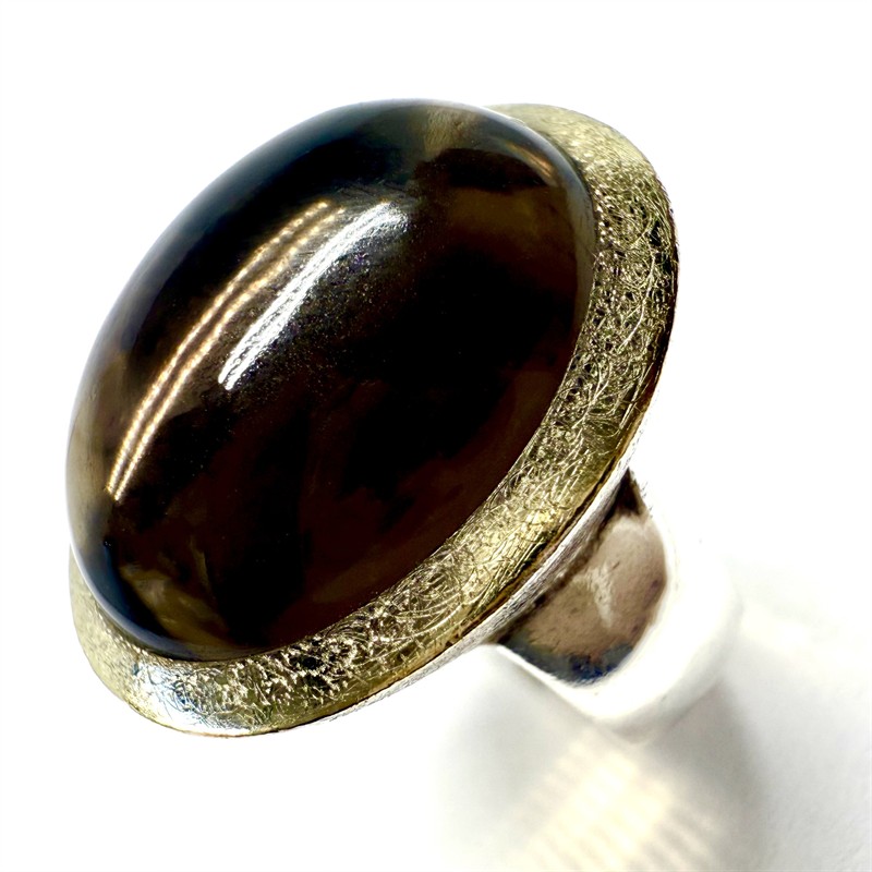 Výrazný stříbrný prsten zhotovený v nadčasovém, minimalistickým stylu. Šperk byl vyroben ze sterlingového stříbra (925/1000), o celkové váze 14,30 g. Prstenu vévodí velký kouřový topaz hladkého brusu. Kámen rámuje kontrastně zlacená cargle s matovaným povrchem. Velikost 57. Profesionálně vyčištěno, perfektní stav.