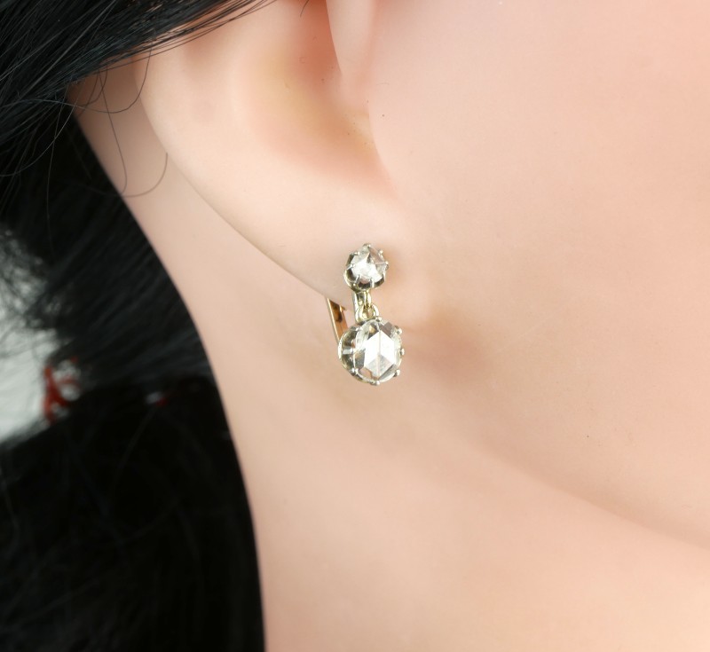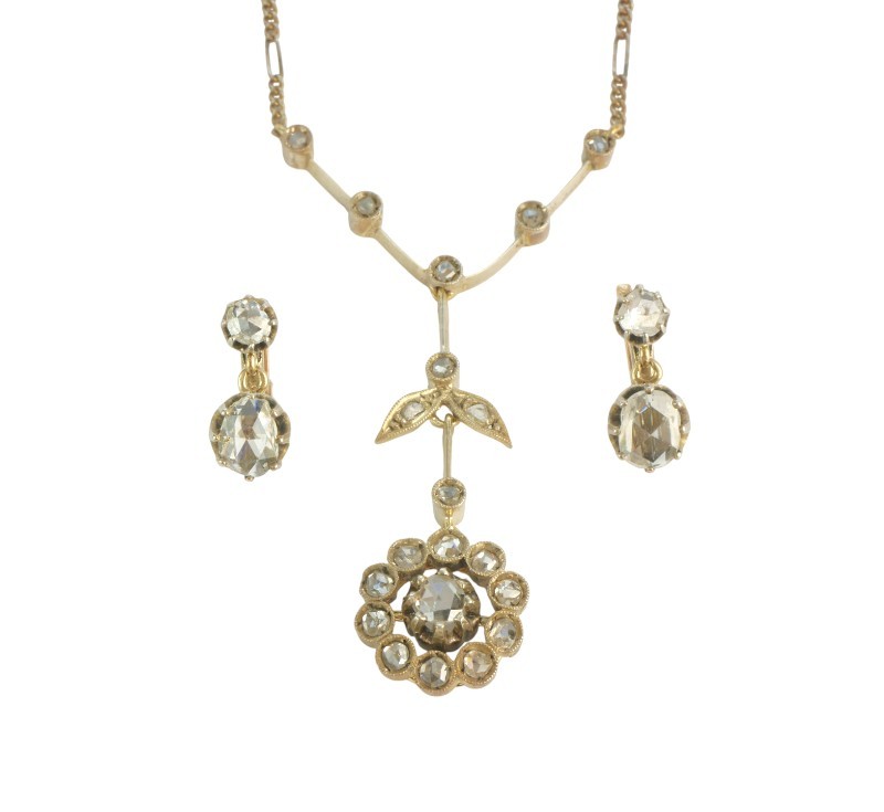 Starožitná secesní souprava, náhrdelník a náušnice osazené přírodními diamanty routového brusu, přelom 19./20. století, počátek secese, náhrdelník i náušnice jsou kombinací zlata a stříbra, Au 750,740/1000 a Ag 925/1000 o celkové hmotnosti 8,4 g, délka náhrdelníku 42 cm, délka náušnic 1,3 cm.