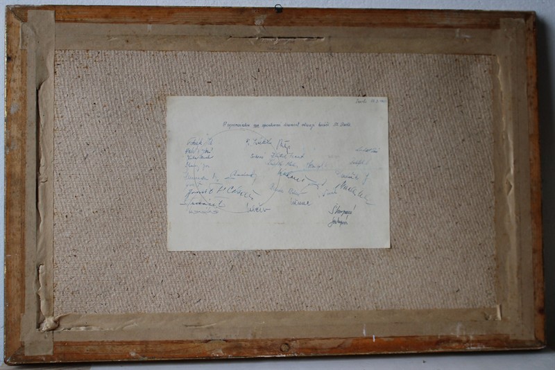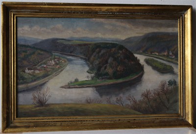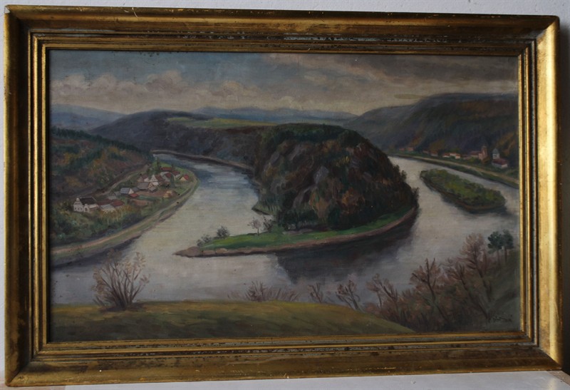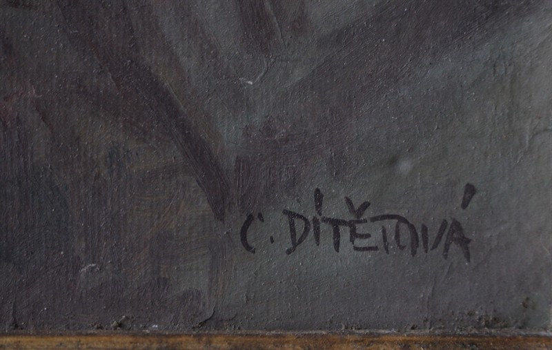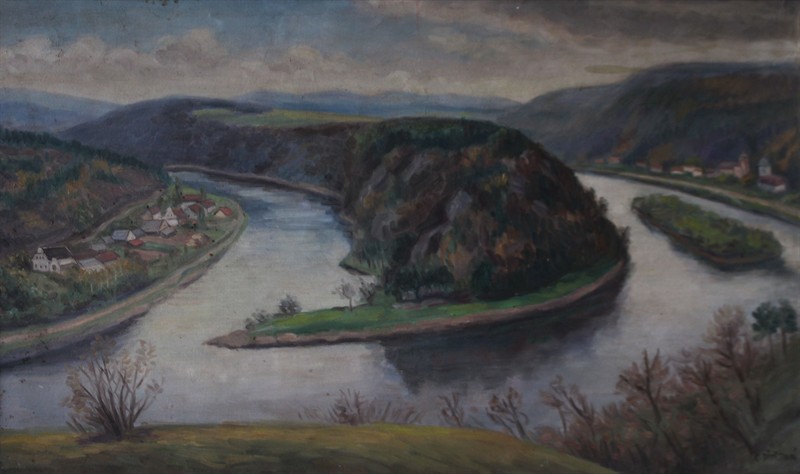 Dítětová - Vesnice u řeky Signováno viz foto. Olej na kartonu. Rozměry malba: 43 x 70 cm.