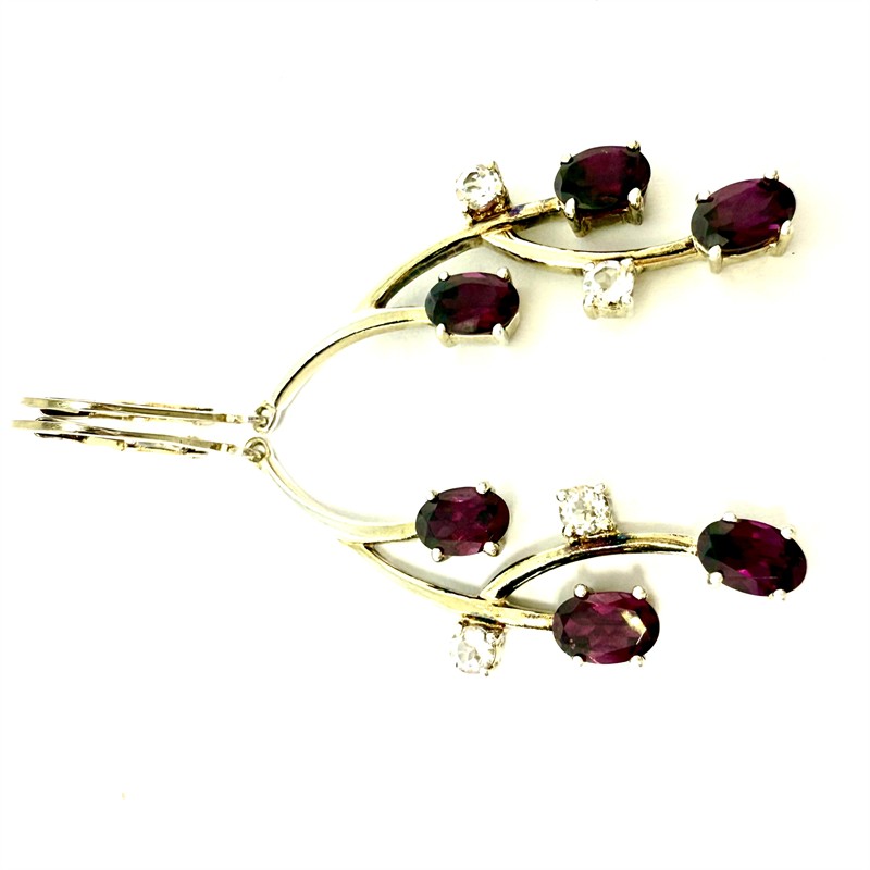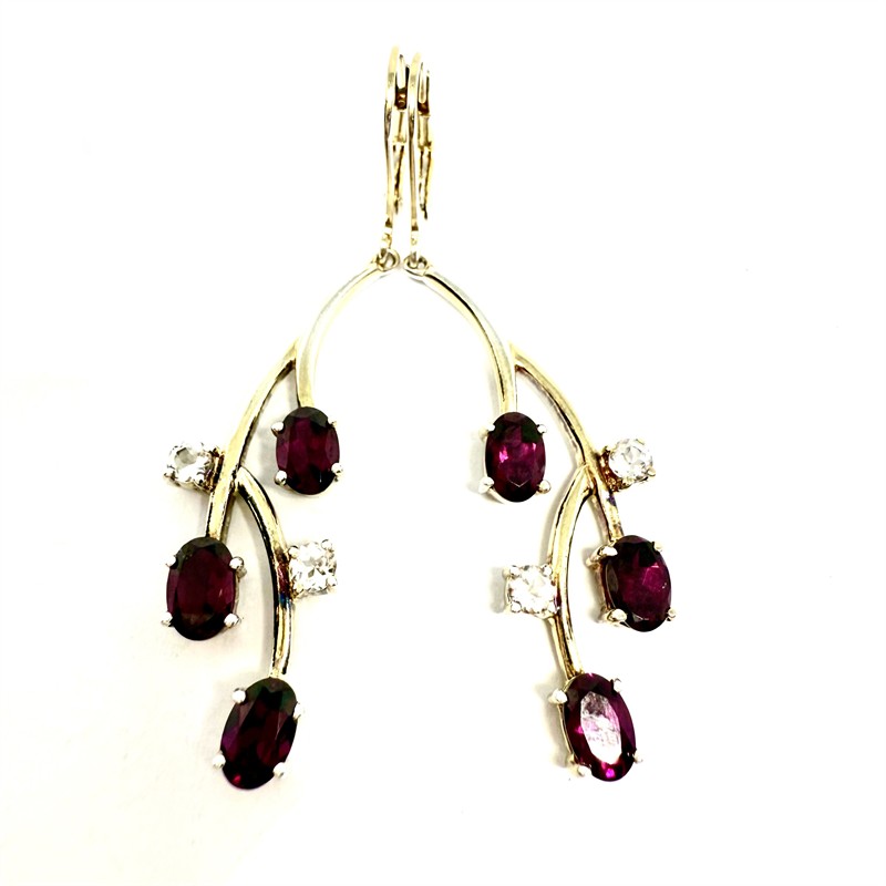 Půvabné, delší závěsné náušnice ze zlaceného stříbra. Náušnice byly zhotoveny ze sterlingového stříbra (925/1000) a jsou zdobeny fialovými kameny fazetového brusu a světlou kubickou zirkonií. Celková váha 5,90 g. Délka 5 cm. Profesionálně vyčištěno, perfektní stav.