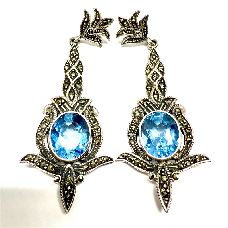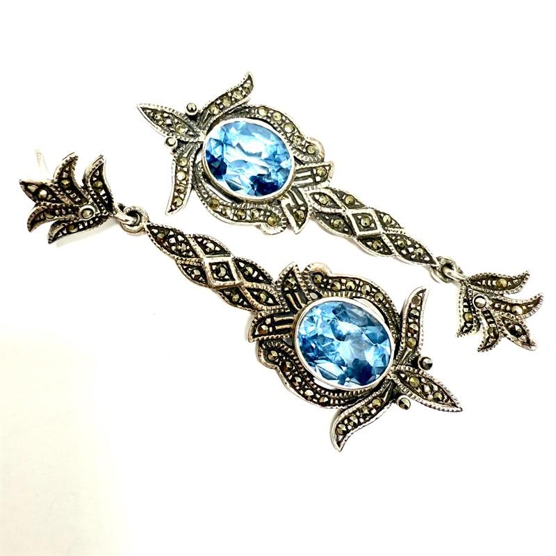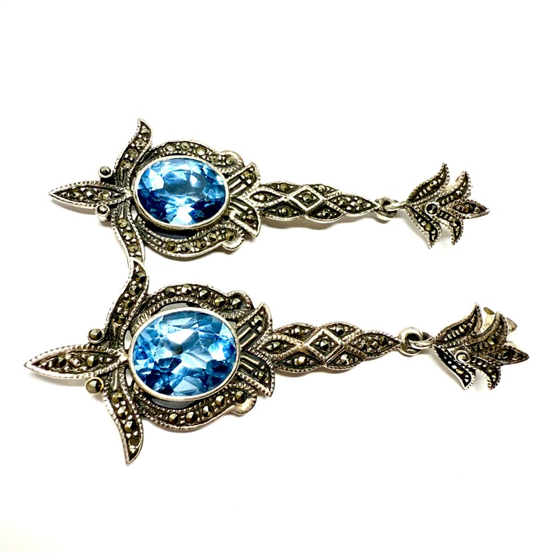 Nepřehlédnutelné, poutavé, dlouhé stříbrné náušnice se zapínáním na puzetu. Vyrobeny ze sterlingového stříbra (925/1000), o celkové váze 14,37 g. Náušnice zdobí velké množství elegantně se třpytících markazitů a centrální, jiskrný blankytně modrý kámen fazetového brusu. Délka 6,3 cm. Výborný stav.