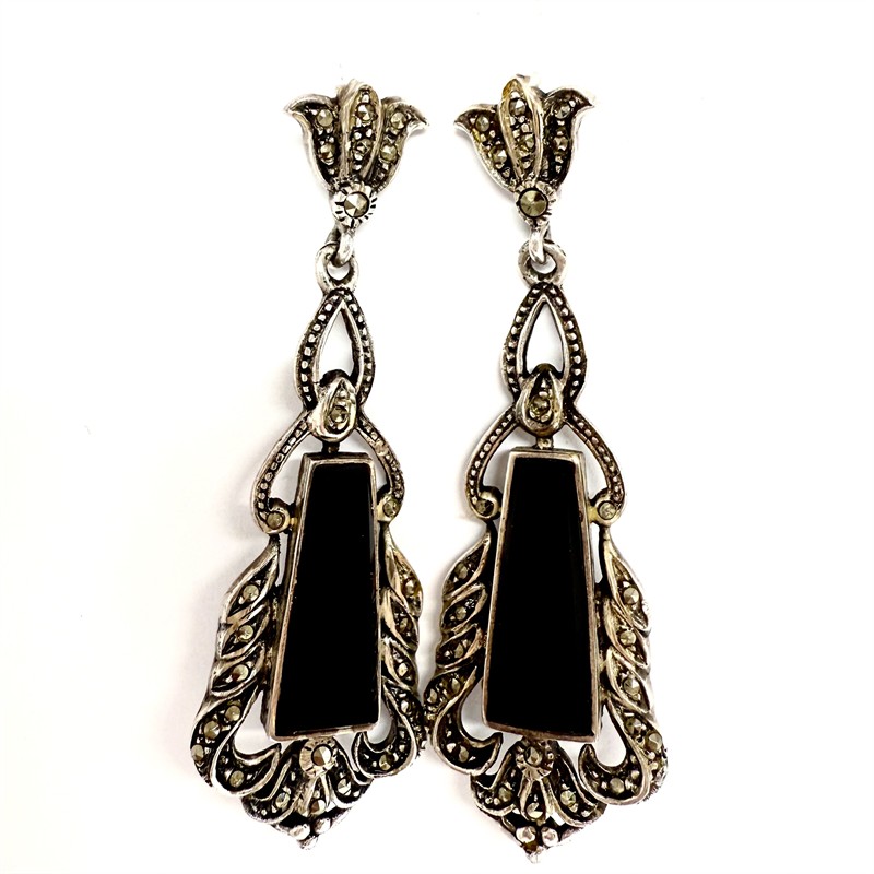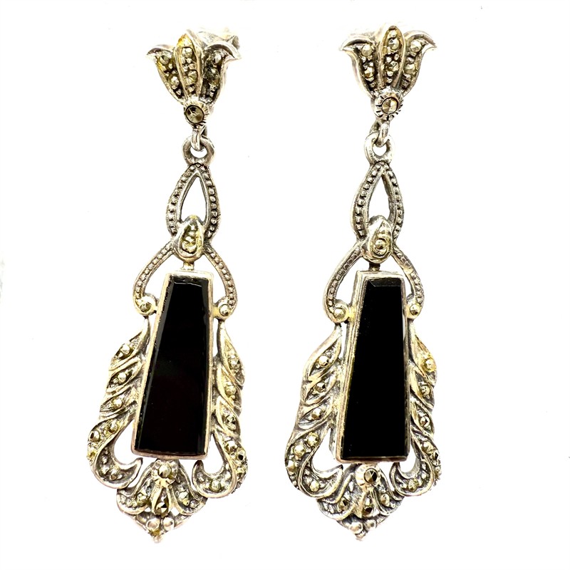 Dlouhé stříbrné náušnice s onyxem a markazity