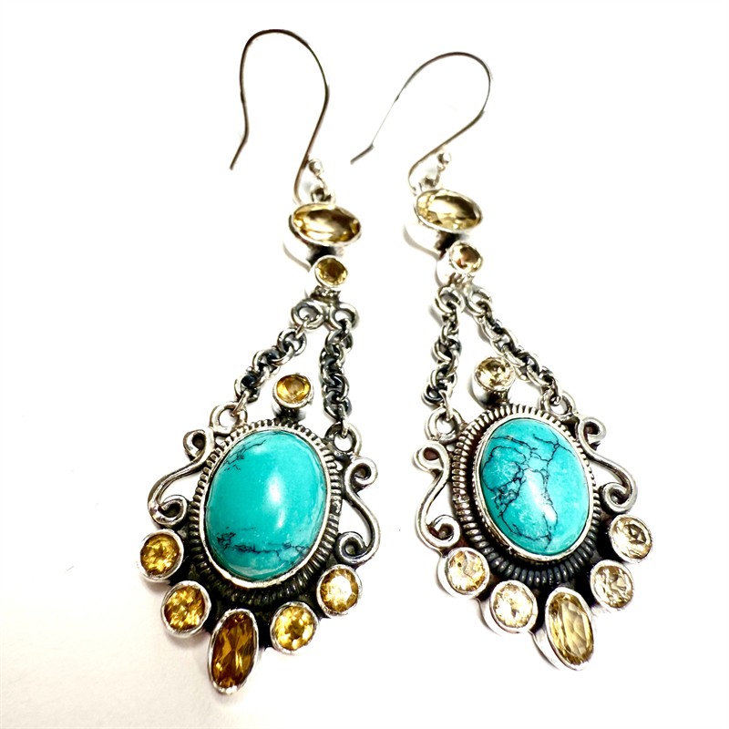 Výrazné,dlouhé,stříbrné náušnice s drahými kameny. Byly vyrobeny ze sterlingového stříbra (925/1000),o celkové váze 12,12 g. Náušnice zdobí tyrkys,kontrastně dozdobený žlutými citríny. Délka cca 6,5 cm. Náušnice byly vyčiětěny zlatnicí a jsou v perfektním stavu.