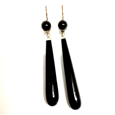 Elegantní, nadčasové, stříbrné náušnice s onyxy. Náušnice byly vyrobeny ze stříbra ryzosti 835/1000, háčky ze zlaté slitiny o ryzosti 280/1000. Osvědčení Puncovního úřadu. Náušnicím dominuje protáhlý, kapkovitý ověs z onyxu. Nadčasovou designovou zajímovostí je, že jeden z ověsů je zhruba o 0,5 cm delší než druhý. Při nošení neznatelné. Celková váha 5,16 g. Délka cca 5,5 cm. Starý, originální šperk ve velmi dobrém stavu.