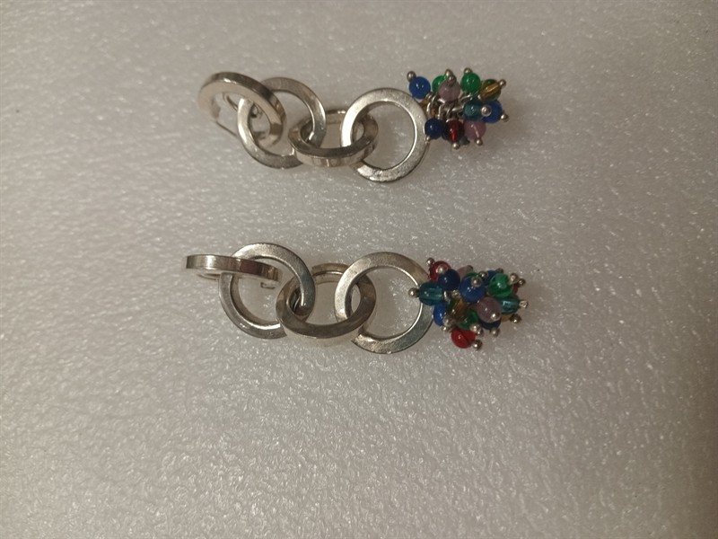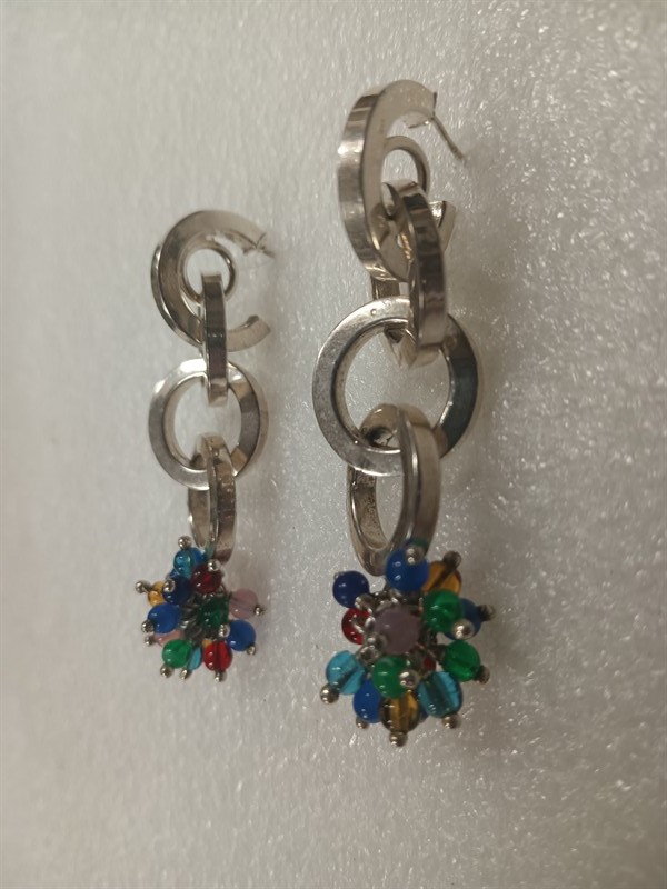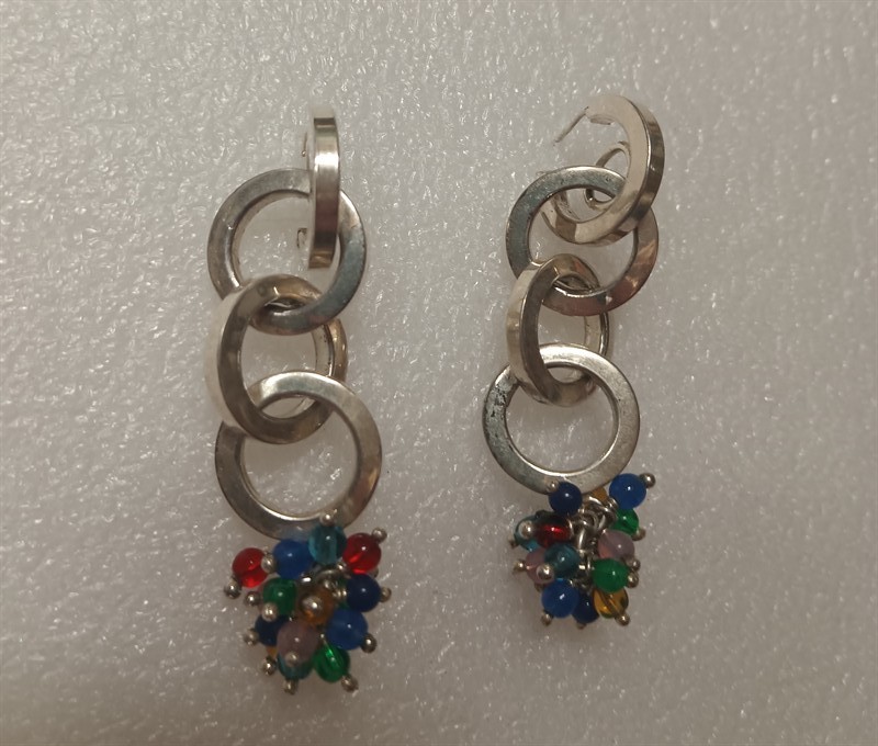 Výrazné kruhové náušnice vyrobené ze stříbra ryzosti 925/1000 s barevnými kuličkami na konci . Délka 6,5 cm . Hmotnost 18,37 cm .