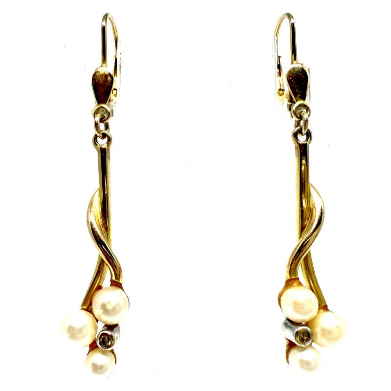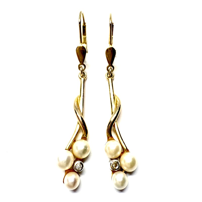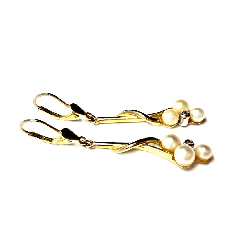 Elegantní, delší, závěsné náušnice. Zhotoveny ze 14ti karátového zlata (585/1000), o celkové váze 4,42 g. Náušnice zdobí bílé perly a drobný briliant. Délka cca 4,5 cm. Perfektní stav.