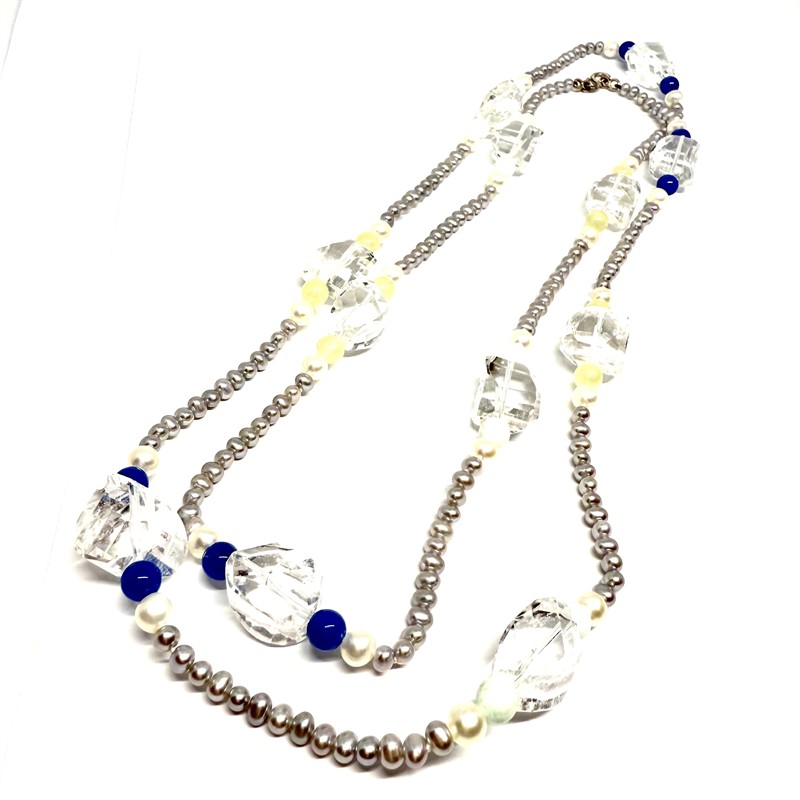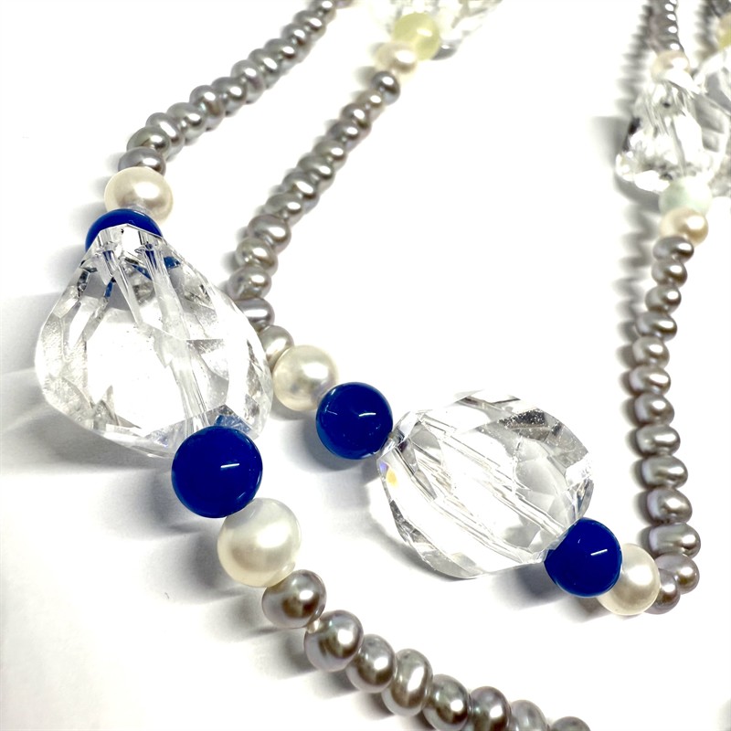Půvabný, dlouhý náhrdelník zhotovený z říčních perel v barvě holubí šedi, jiskrných horských křištálů a decentních chalcedonů. Šperk o délce 107 cm je zakončen minimalistickým zapínáním ze sterlingového stříbra 925/1000. Možnost nošení na vícero způsobů - dvojitě, nebo jako dlouhý náhrdelník. Perfektní stav.