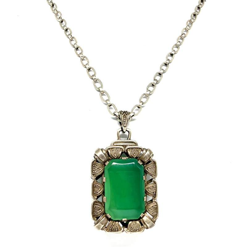 Dlouhý náhrdelník ze stříbra zhotovený v období první republiky. Šperk - dlouhý, masivnější řetízek zdobí velký, odnímatelný závěs. Šperku dominuje tmavě zelený chalcedon. Komplet byl zhotoven ze stříbra ryzosti 835/1000, o celkové váze 25,11 g. Délka řetízku 68 cm, avšak díky větším očkům může být závěs nošen v libovolné délce. Rozměry závěsu cca 4,8 x 2,8 cm. Starý, autentický šperk v perfektním stavu.