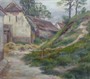 Olej na papíru 33 cm x 38 cm. Nesignováno. Období a styl české krajinomalby ovlivněné tvorbou vynikajícího českého malíře Antonína Slavíčka. Pohled na zákoutí u starých domů s pěšinou vedoucí do travnatého svahu. Novodobější rám s novou paspartou a sklem. Čechy 1900 - 1920. Celkový rozměr s rámem 50,5 cm x 53,5 cm.