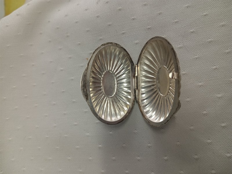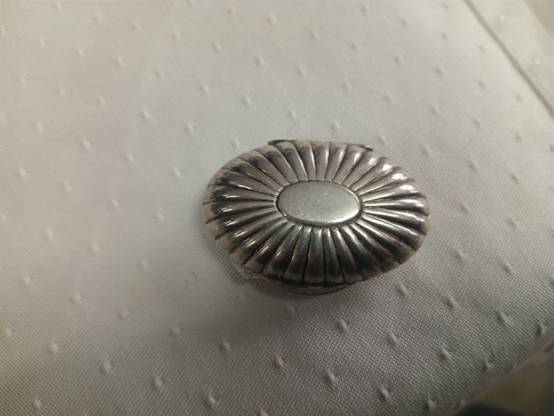 Dózička na léky , stříbro ryzosti 800/1000 , rozměry 5,2 x 3,5 cm . Hmotnost 17,34 gr.