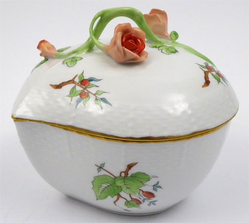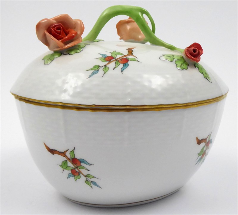 Bílý, barevně ručně malovaný a zlacený porcelán. Porcelánka Herend. Porcelánová dóza ve tvaru listu s reliéfním dekorem růžiček s poupaty na klenutém úponku. Na spodním okraji víka i horním okraji těla dózy jemné žebrování ohraničené zlacenými linkami. Dekorativnost dózy, možné použití i jako noblesní cukřenka, podtrhují stylizované větvičky s plody ovoce. Značeno zespodu: značka HEREND platná pro uvedené období. Maďarsko, Herend 1949 - 1970. Výška 12 cm, šířka 14 cm, hloubka 12 cm.