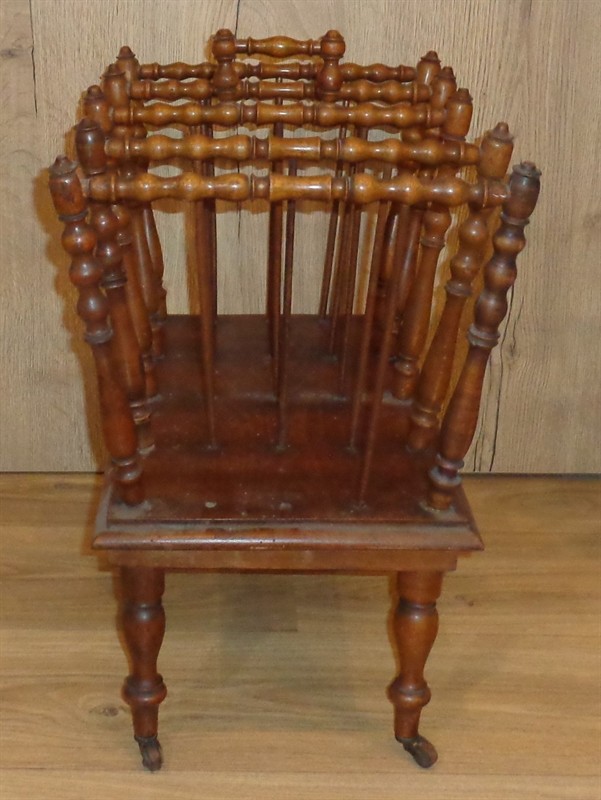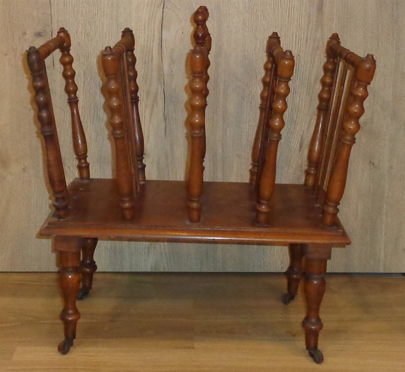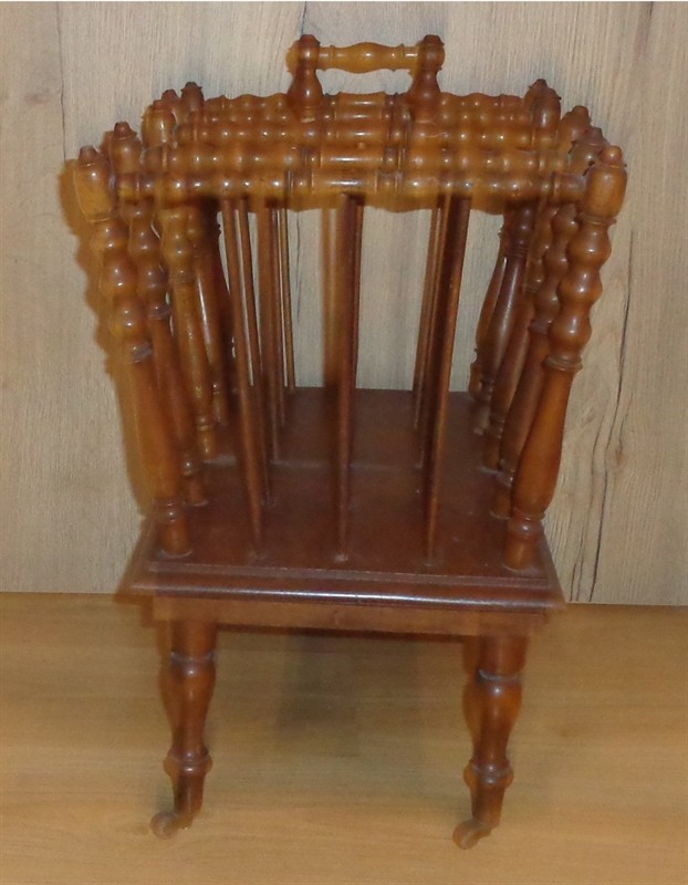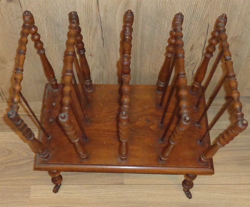 Dřevěný stojan na noviny či noty nebo něco podobného,pojízdný,čtyři otočná,kovová kolečka,nálezový stav,na boku chybí dvě šprušle,viz foto,rozměr 51x51x33 cm.