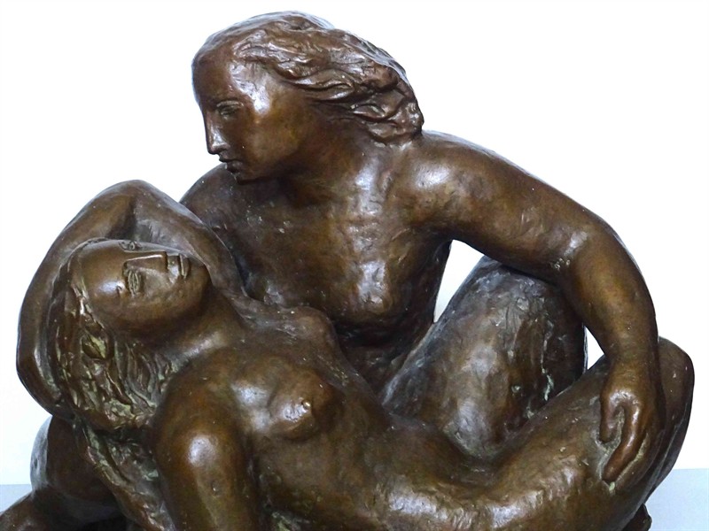 staré bronzové sousoší od sochařky Mary Durasové, délka 35 cm, výška 26 cm, nesignováno, 20. - 40. léta