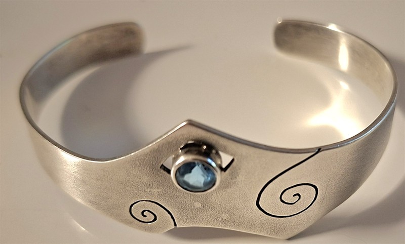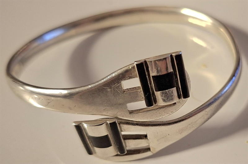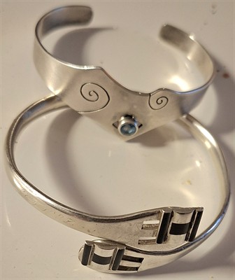 Stříbrný náramek ve funkcionalistickém stylu, stříbro ryzost 800/1000 (nově puncováno), rozměr 7,5 x 6,5 cm, 53 g, 20. léta m.s. Stříbrný náramek s modrým kaménkem ve stylu art deco, stříbro ryzost 800/1000, syntetický safír, nově puncováno, rozměr 6,5 x 5,5 cm, hmotnost 22 g, 20. léta m.s.