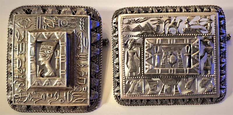 1. Obdelníková egyptská brož s královnou Nefertiti s hyerogryfy, rozměr 21g, 4 x 3,5 cm, stříbro 900/1000, dovoz Egypt, 50, - 60 léta m. s, puncováno egyptským a čsl. dovozovým puncem – lilie Obdelníková egyptská brož s centrálním posvátným skarabeem a dalšími výjevy, rozměr 4,5 x 4 cm, hmotnost 19g, stříbro 900/1000, dovoz Egypt, 50. - 60. m.s., puncováno egyptským a čsl. dovozovým puncem – lilie