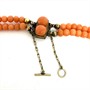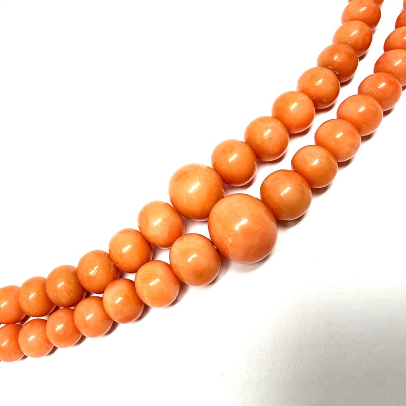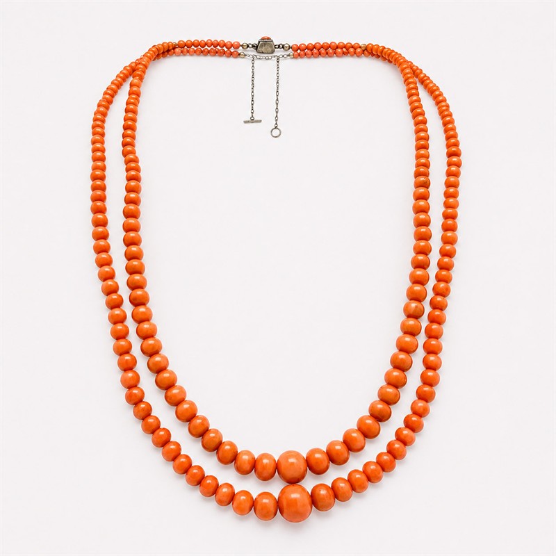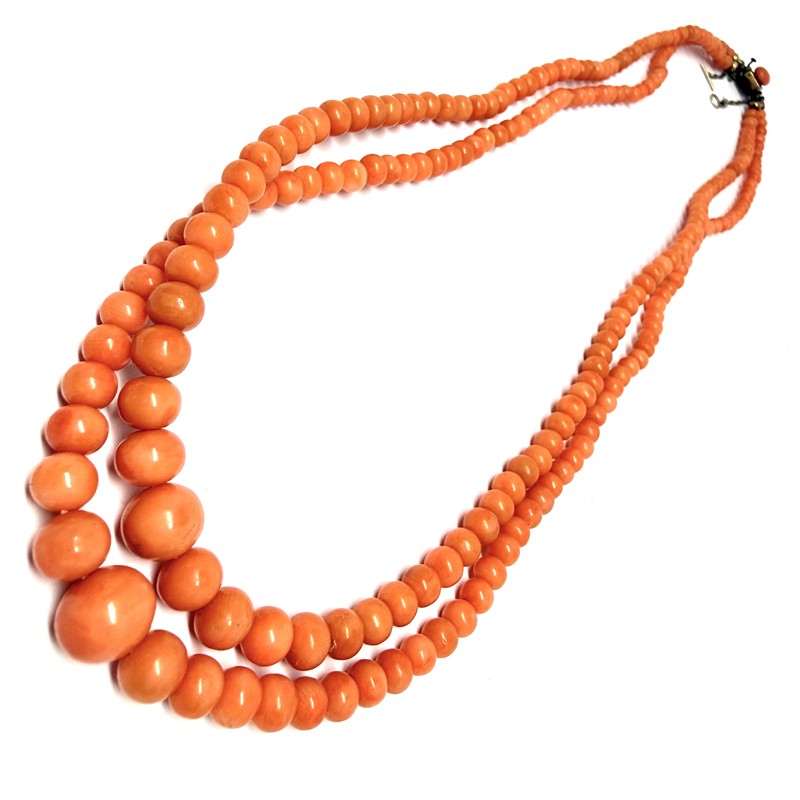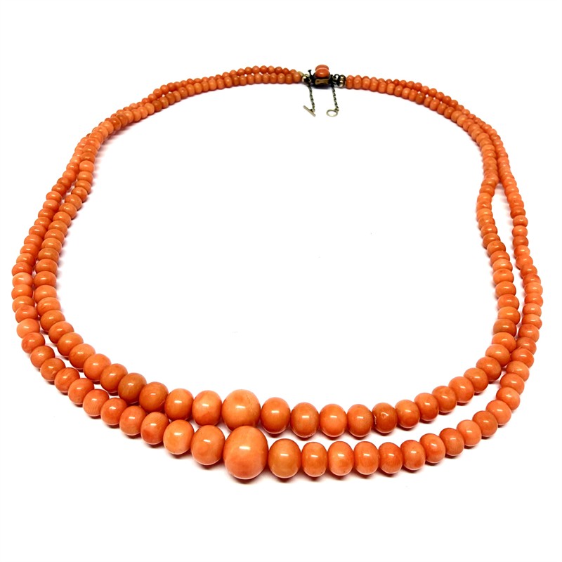 Výrazný, velmi starý korálový náhrdelník. Šperk tvoří dvě řady velkých, vysoce kvalitních korálů sytého lososovitého odstínu. Náhrdelník je dlouhý cca 53 cm, zakončen dekorativním zapínáním se dvěma korály s pojistným řetízkem. Náhrdelník je ve výborném stavu.