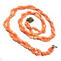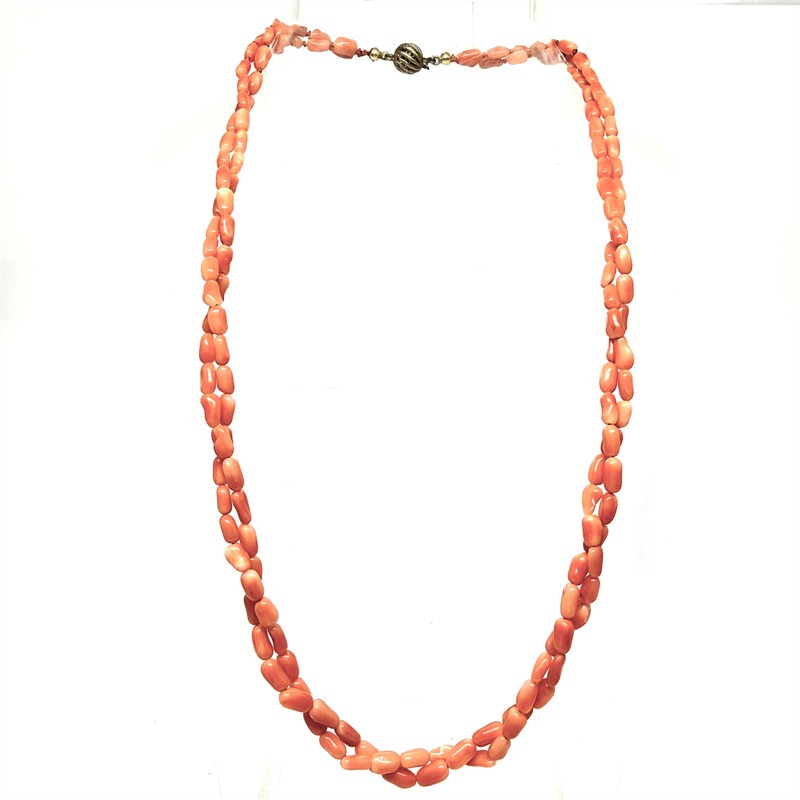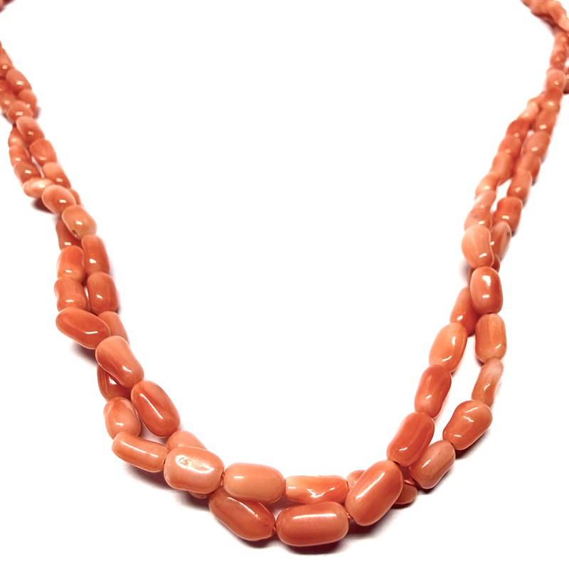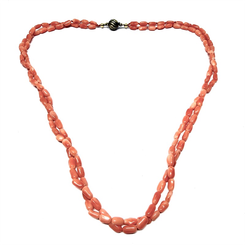 Půvabný náhrdelník z mořských korálů. Šperk tvoří dvě řady mořských korálů krásného, sytě lososovitého odstínu. Šperk je ukončen elegantním zapínáním ze zlaceného stříbra ryzosti 835/1000. Korály jsou částečně prouzlíkovány. Délka 45 cm. Výborný stav.