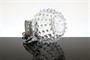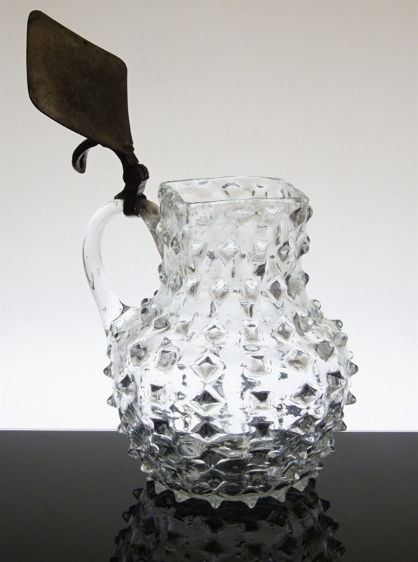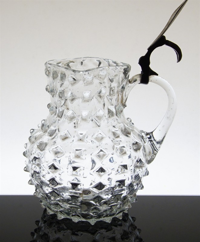 Velmi starý džbánek z devatenáctého století z čirého hutního skla foukané do kovové formy s tzv. Hobnail dekorem a původním kovovým víkem. Džbánek sloužil při stolování na cenné oleje, nebo jiná dochucovadla. Vespod je heft od sklářské píšťaly, práce sklářů pravděpodobně z pohraničí severních Čech. Dobrý stav stav, rozměr i s uchem - v. 15cm, prům. 12cm