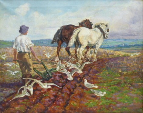 Olej na plátně 58 cm x 73 cm. Signováno vlevo dole s datací 1916. Mladý sedlák orající za pomoci dvou koní pole, na které se slétají ptáci, jež vyzobávají pod krustou hlíny ukrytý hmyz. V dobovém dekorativním rámu s bronzovou patinou. Čechy, rok 1916. Celkový rozměr s rámem 73 cm x 87 cm.