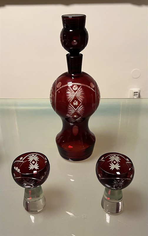 Egermann rubínová přátelská souprava karafa + 2, krásný brus a vzácný tvar, výška karafy 35 cm, nepoškozené.