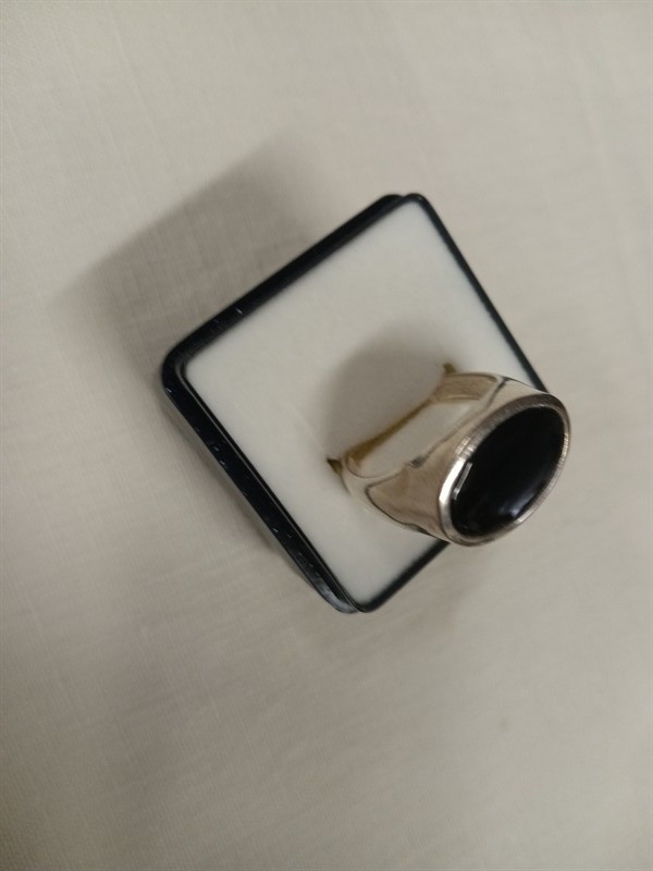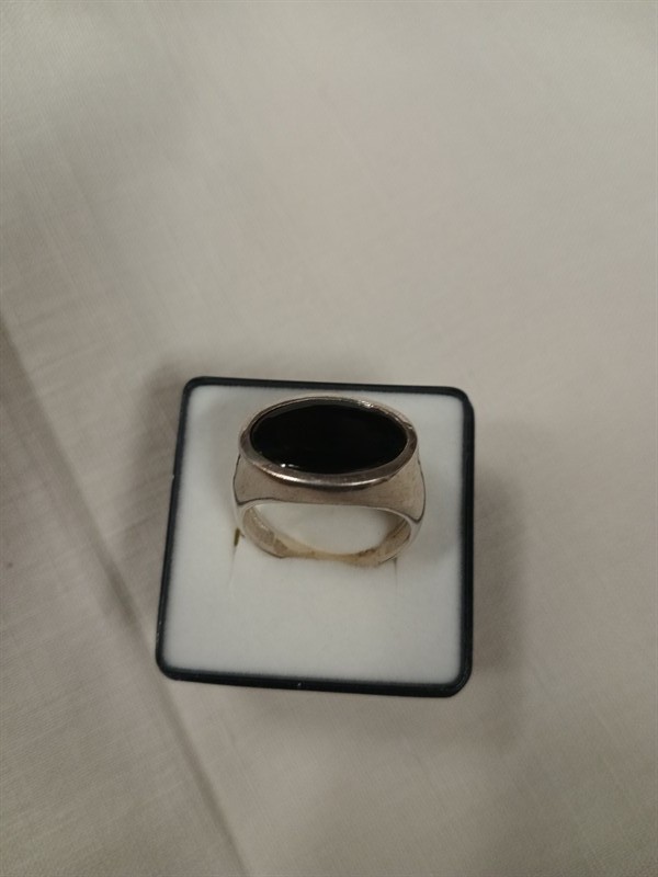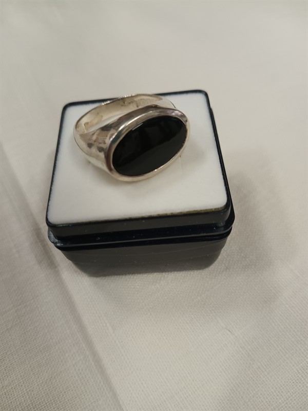 Elegantní nápadný prsten vyrobený ze stříbra ryzosti 935/1000, s oválným onyxem. Velikost 64 , hlava prstenu má rozměry 2 x 1,5 cm . Celková hmotnost je 7,7 gr. Přiložena boleta Puncovního úřadu.