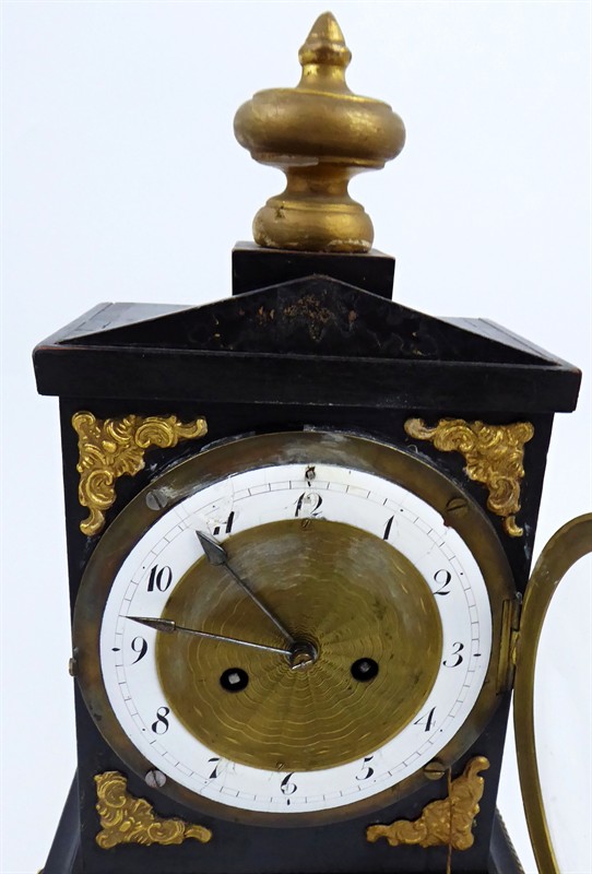 Dřevo černě mořené, zlacené. Období a styl: empír. Stolní empírové portálové hodiny. Stroj s kotvovým krokem, půlové bití na pružiny. Bílé emailové okruží ciferníku s ručně černě malovanými arabskými číslicemi. Gilošovaný mosazný střed ciferníku. Ocelové hodinové ručičky. Hodinová skříňka z černě mořeného dřeva, odstupňovaného tvaru, se zlacenými ozdobami a na čtyřech zlacených dřevěných nožkách ve tvaru lvích tlap. Používaný stav viz fotografie. Bez klíčku. Funkční. Vzhledem ke stáří hodinek bez záruky přesnosti chodu a dlouhodobé funkčnosti. Střední Evropa 1800 - 1820. Výška 42 cm, šířka 22 cm a hloubka 13 cm.