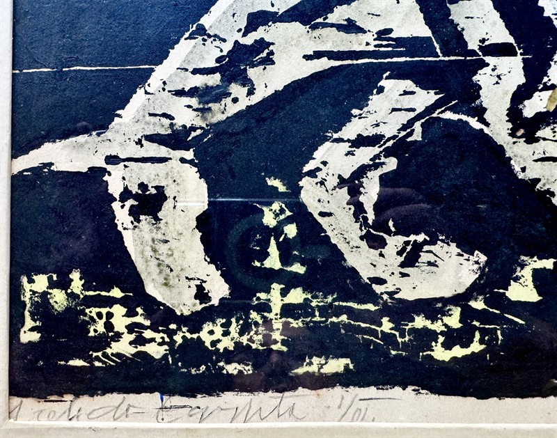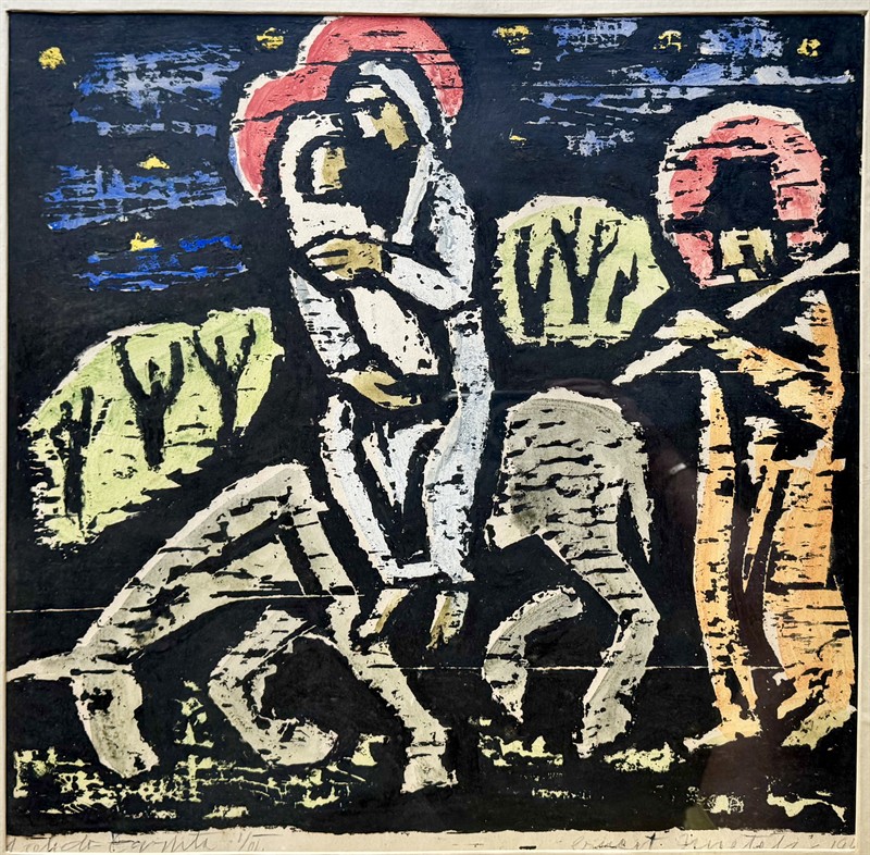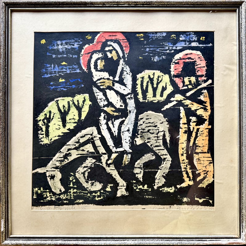Ručně a autorsky kolorovaný dřevoryt na papíře o velikosti 48 x 49 cm, celkový rozměr 61/61 cm. Signováno vpravo dole “Ernest Zmeták1946” a vlevo přípis “Útěk do Egypta”. Ernest Zmeták (1919-2004) byl významný slovenský grafik a malíř.