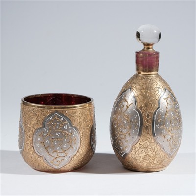 Kolem r. 1895, sklárna Moser, Karlovy Vary, značeno zespodu malovaným číslem, rubínové sklo bohatě dekorované zlatem a stříbrem (nebo platinou) a bílou barvou, výška 12 a 5,5 cm. Ref.: Potvrzeno archivem sklárny Moser, Karlovy Vary.
