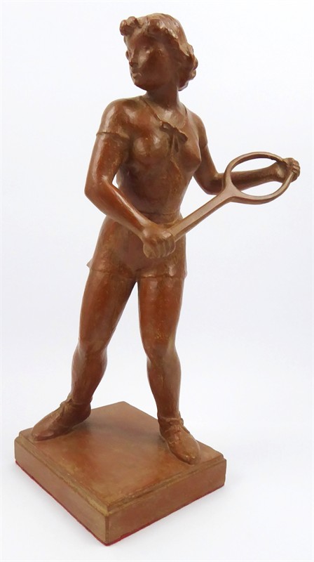Terakota. Autor: František Bartoš (1911-1981) akademický sochař vystudovaný na Akademii výtvarných umění v ateliéru slavného Josefa Gočára. Signováno na plintě na horní části: Fr. Bartoš. Terakotová socha velmi precizně ztvárněné anatomie tenistky zachycené při bekhendu, jednom ze základních tenisových úderů, kdy se míč zasahuje raketou podél levé části těla. Na obdélném nižším podstavci. Československo, 40. až 50. léta minulého století. Výška 39 cm, rozměr podstavce 15 cm x 13 cm.