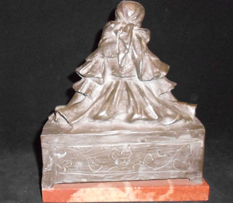 FRANTIŠEK ROUS - Krojovaná dívka sedící na truhle, bronz Bronzová plastika, původní odlitek. Výška 25 cm, k tomu podstavec ze sliveneckého mramoru 2 cm, celkem 27 cm. Výborný stav. Publikováno v monografii Heleny Johnové (srovnání s obdobnou prací této keramičky). Krásný odlitek , od významného českého sochaře ze začátku 20. století František Rous (1872-1936), sochař, studia v Německu, Paříži, Vídni. V soutěži o pomník sv. Václava skončil třetí za Myslbekem a Schnirchem.