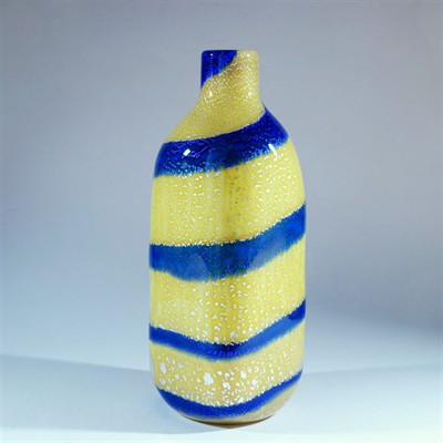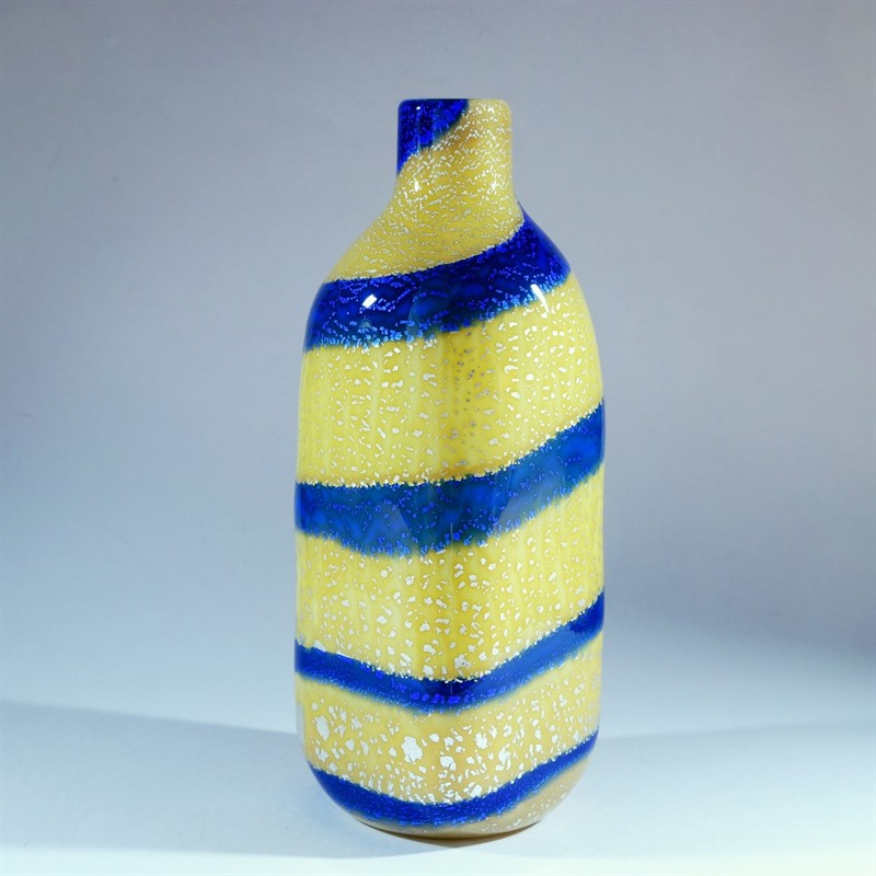 návrh kolem r. 1950 muránský sklářský výtvarník Giulio Radi (1895-1952), provedení A.Ve.M., Murano, výška 27 cm, žlutý opál s vtavenými modrými opálovými pruhy a natavenou stříbrnou folií, přesklívané čirým sklem, zespodu drobná prasklinka z pnutí podmíněná výrobou. Srov.: BAROVIER, Marina, et al. Il vetro di Murano alle Biennali 1895-1972. Milano: Leonardo Arte, 1995, s. 61.