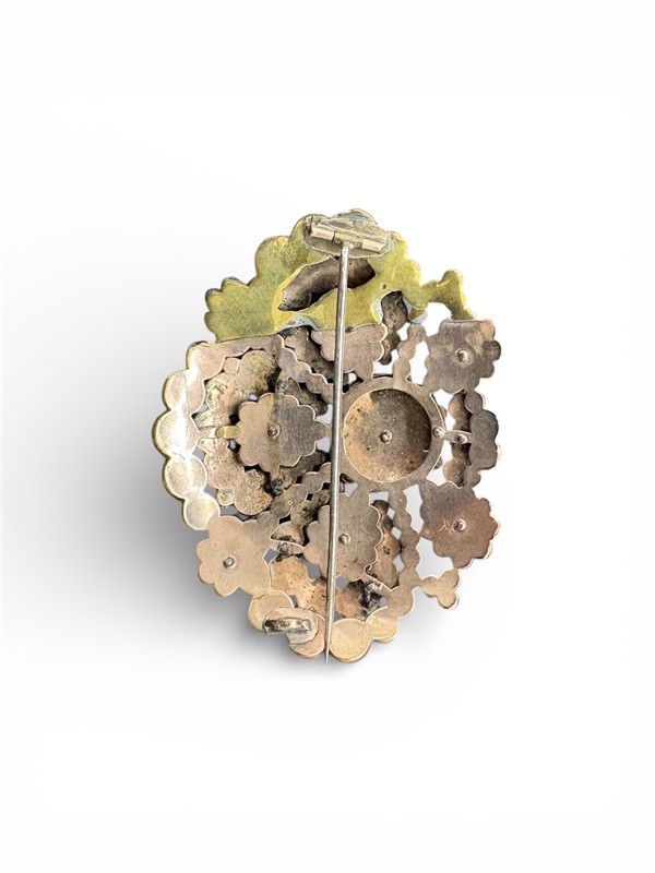Brož s českými granáty v tombaku. Čechy, 2. polovina 20. století. Zezadu opravováno. Velikost: 5,5 x 4 cm.