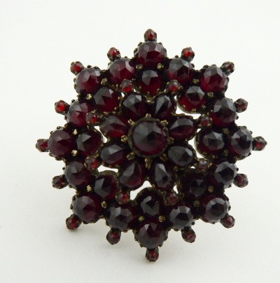 Tombak, přírodní ručně broušené české granáty. Celková hmotnost 5,77 g. Brož z tombaku ve tvaru hvězdy s pravými českými granáty routového výbrusu. Čechy 1870 - 1900. Průměr brože 35 mm.