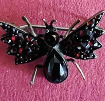 Motýl, jemná, menší brož v podobě motýla s tykadly, tělíčko a křídla osázena českými granáty kulatého a kapkového routového brusu. Kameny mají jiskrnou barvu a jsou fasovány nýtkovou technikou. Půvabný šperk, česká granátnická práce z konce 19. století. Zasazeno v tombaku, neznačeno., délka 25 mm, šířka 21 mm. Zapínání na "C".