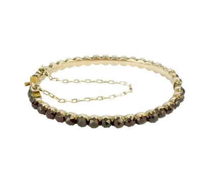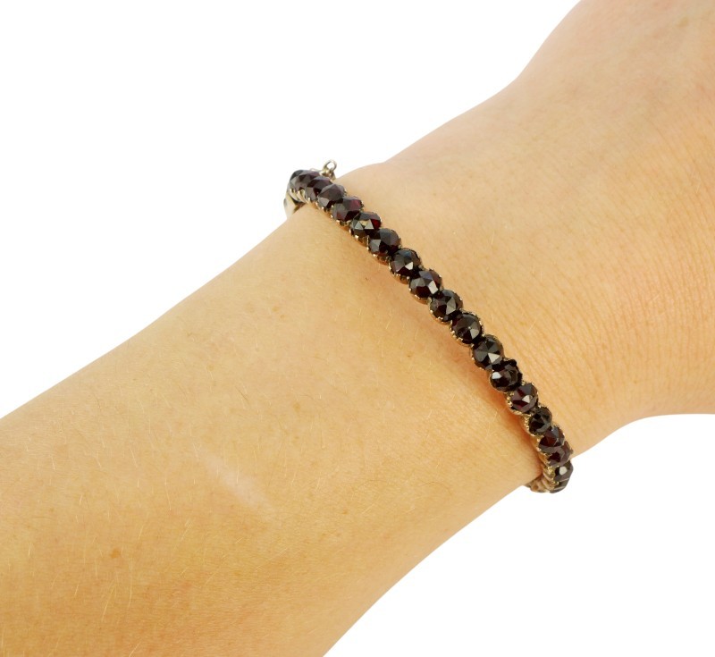 Náramek s krásnými českými granáty zasazenými v tombaku. Vnitřní rozměry náramku jsou 4,6 x 5,4 cm. Zapínání je opatřeno pojistným řetízkem.
