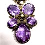 Unikátní, velmi starý, masivní náhrdelník ze zlaceného stříbra. Náhrdelník tvoří jednotlivé články, z nichž každý je osazen větším, sytě fialovým ametystem fazetového brusu. Součástí náhrdelníku je odnímatelný závěs ve tvaru květu, který může být samostatně využíván jako efektní brož. Délka šperku je regulovatelná, díky čtyřem prodlužovacím článkům. Stříbro ryzosti 780/1000, celková váha 70,56 g. Vyhotoveno osvědčení Puncovního úřadu. Délka 41,5 cm + 8 cm. Zcela perfektní, sbírkový stav.