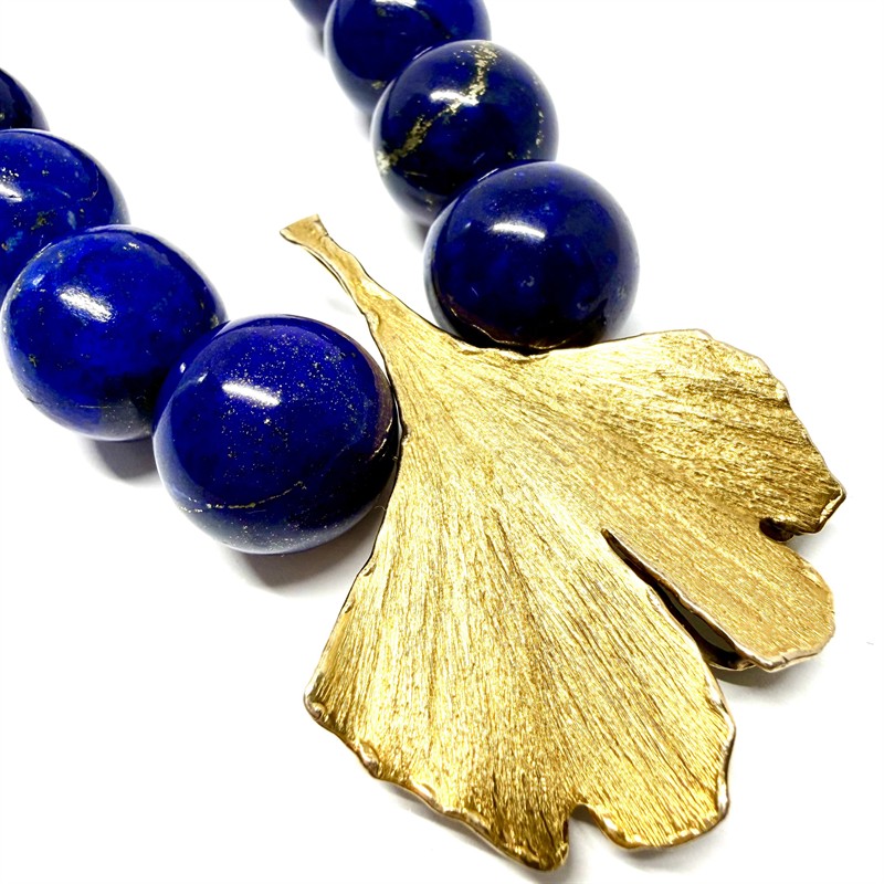 Ateliérový náhrdelník zhotovený z vysoce kvalitního lápisu lazuli. Zapínání šperku bylo zhotoveno ze zlata ryzosti 333/1000. Zapínání je rafinovaně skryto v detailně, realisticky provedeném listu ginkgo biloba. Délka 48 cm. Rozměr zlatého listu 5,5 x 4 cm. Celková váha 224,24 g. Perfektní stav.