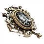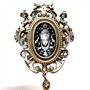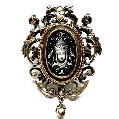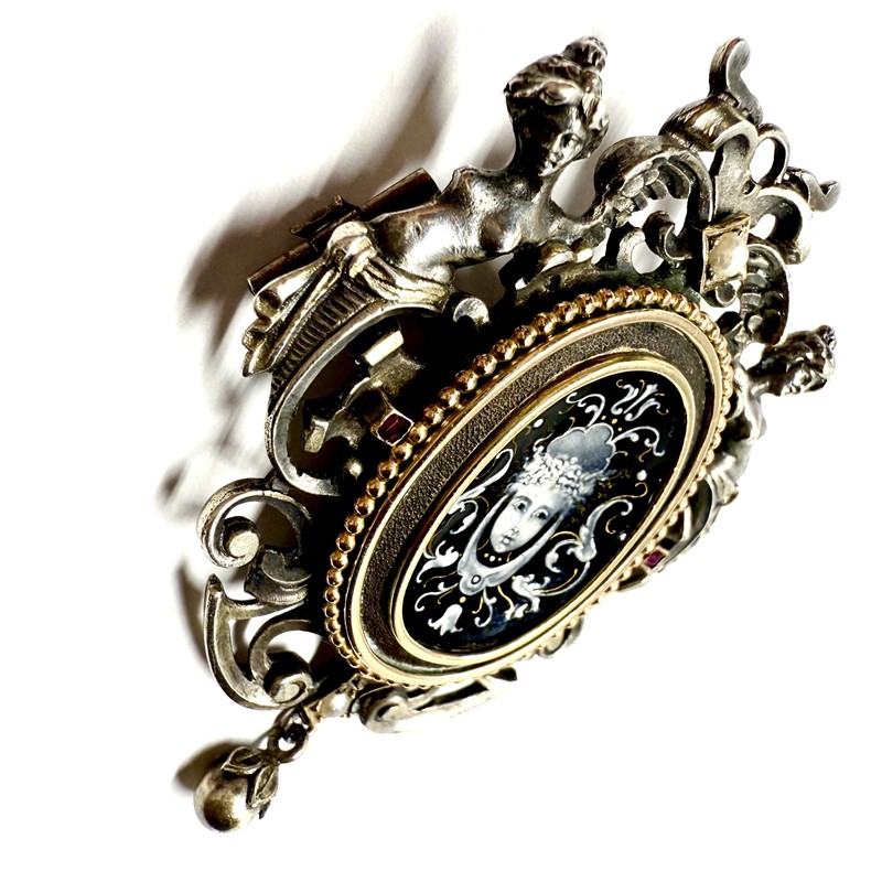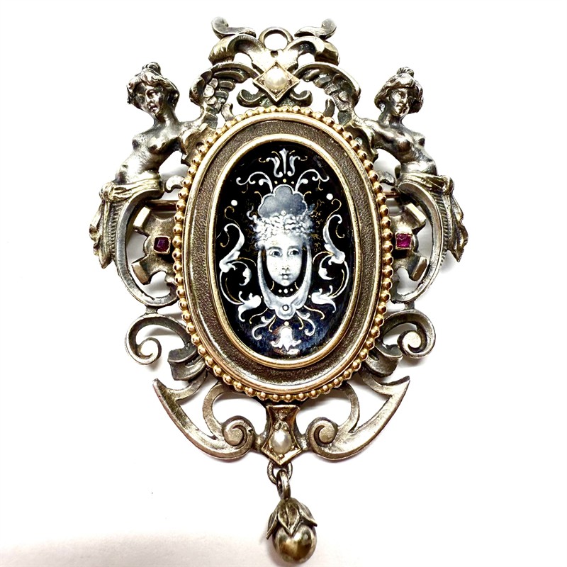 Unikátní, sbírková, velmi stará brož větších rozměrů. Šperk byl zhotoven ze stříbra ryzosti 800/1000 v kombinaci se zlatem 14ti karátovým. Osvědčení Puncovního úřadu. Brož má symetrickou kompozici s bohatým ornamentem, motivy volut a dvojici ženských postav po stranách - typické prvky neorenesančního nebo neobarokního šperkařství. Broži vévodí malba šlechtičny zhotovená ve smaltu, orámovaná trojitým, zlatým rámečkem. Dojem umocňují dva velmi drobné, též ve zlatě zasazené rubíny a dvě říční perly. Rozměry 6,5 x 4,5 cm. Výborný stav.